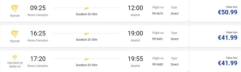 Для непродолжительных поездок между европейскими городами я довольно часто выбираю лоукостеров. Ирландский бюджетный перевозчик осуществляет рейсы из Рима в Мадрид три раза в день, утром и дважды вечером.