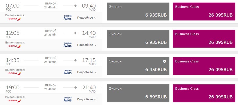 | Iberia (IB 658) Airbus A320 | 07:35 Рим (FCO) | 2 ч. 35 мин | 10:10 Мадрид (MAD) | чт с 02.04 |