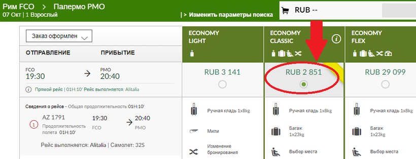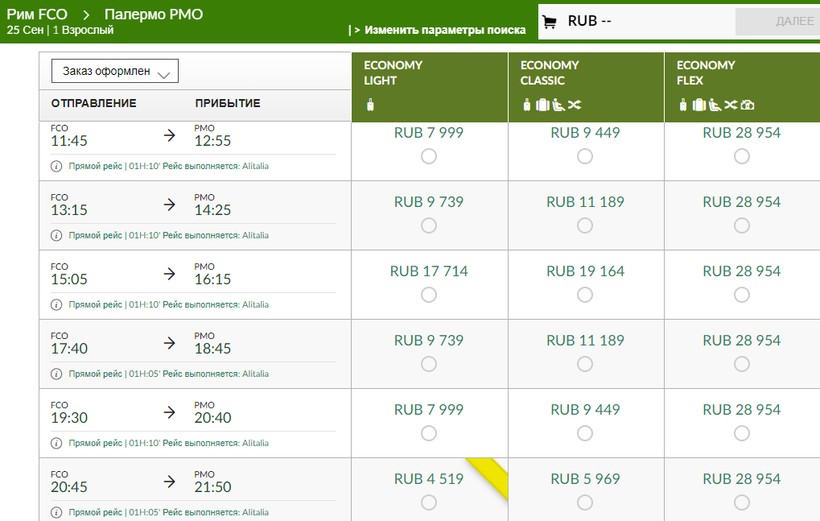 Alitalia (AZ 1799) Airbus A320 NEO | 12:20 Рим (FCO) | 1 ч. 10 мин | 13:30 Палермо (PMO) | 30 сентября |