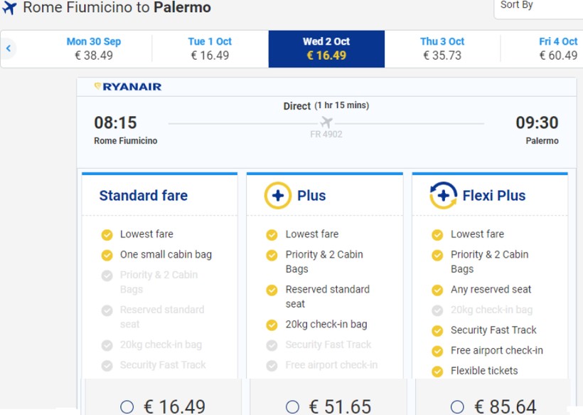 Подведу итоги по прямым авиаперелетам: для путешествий налегке я предпочитаю полеты с Ryanair, потому что по стоимости он явный лидер. Но для перелетов с багажом я выбираю Alitalia, потому что на крыльях этой компании можно улететь всего за 3000 ₽, в то время как у лоукостеров авиабилеты обойдутся от 5000 ₽. Кстати, ни один из перевозчиков (обеспечивающих прямое сообщение) не предлагает перелет по маршруту в бизнес-классе.