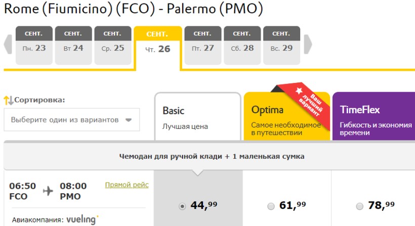 Расписание полетов у оператора могу назвать удобным, ведь его самолеты вылетают по маршруту по десять раз в день, что позволяет попасть в сицилийскую столицу в любое время суток. Что касается стоимости, я предпочитаю авиапутешествия по тарифу Economy Classic, потому что он включает багаж до 23 кг, и на ближайшие даты билеты только туда обходятся в среднем в 6000–9500 ₽, в обе стороны — от 12500 ₽.