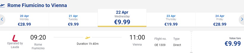 Часто для своих поездок я предпочитаю пользоваться услугами бюджетных перевозчиков, так как именно они предлагают самые выгодные варианты. Наиболее дешевые предложения есть у австрийского лоукостера Laudamotion, который совершает вылеты до Вены один раз в сутки, рейс утренний.