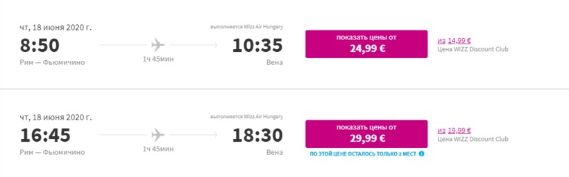 | Ryanair (FR 1644) Airbus А320 | 20:20 Рим (FCO) | 1 ч. 45 мин | 22:05 Вена (VIE) | 15, 22 октября |