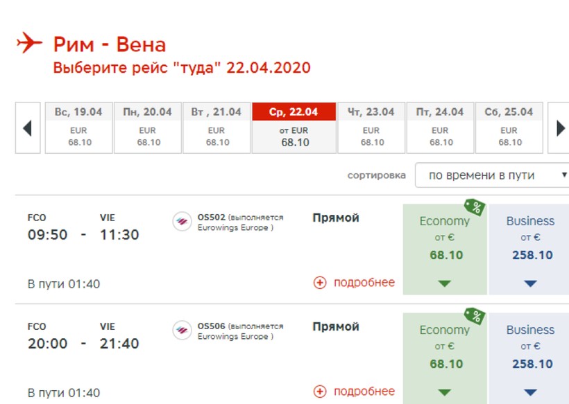 Также есть две категории бизнес-класса, но я не рассматриваю их, потому что они стоят от 260 евро (от 18500 рублей). Не считаю целесообразным переплачивать за непродолжительный полет. Обратите внимание, что перелеты из Рима в Вену выполняются перевозчиком Eurowings Europe.