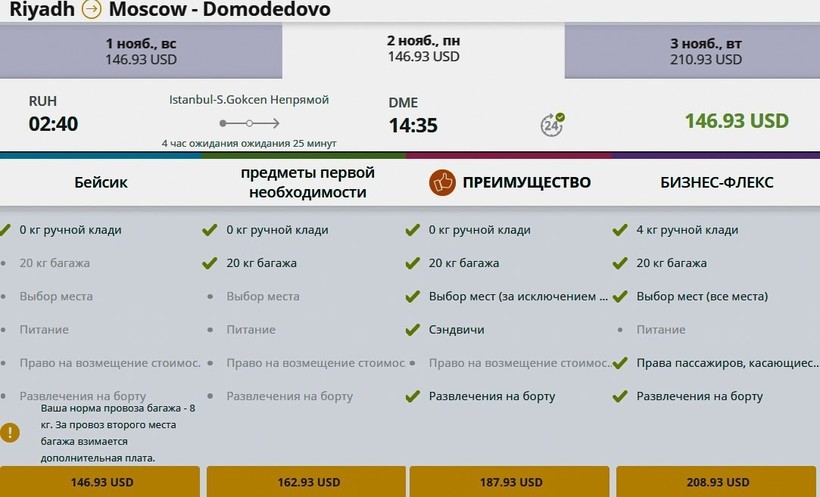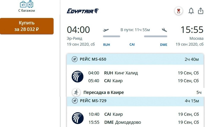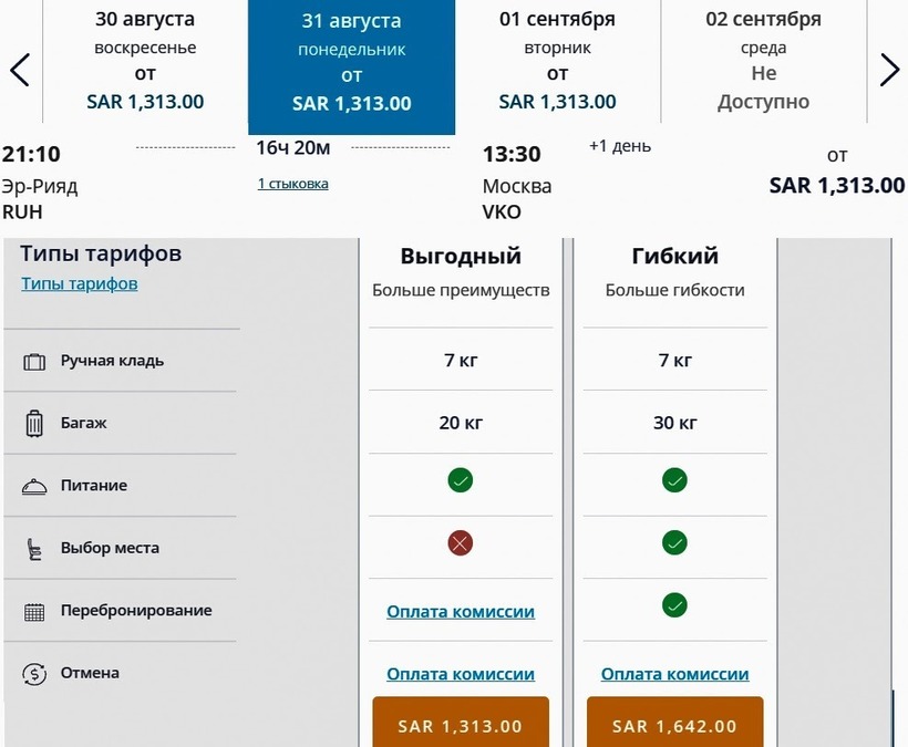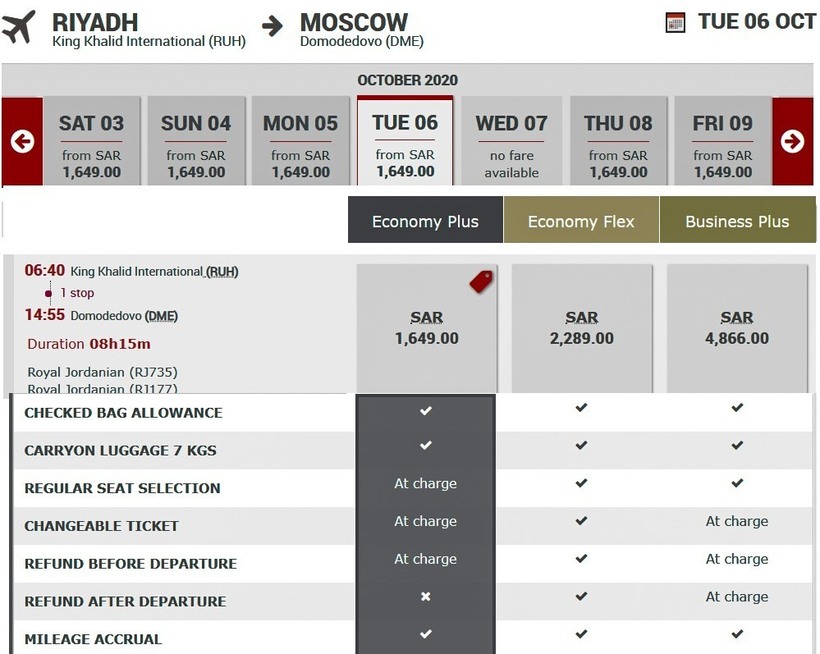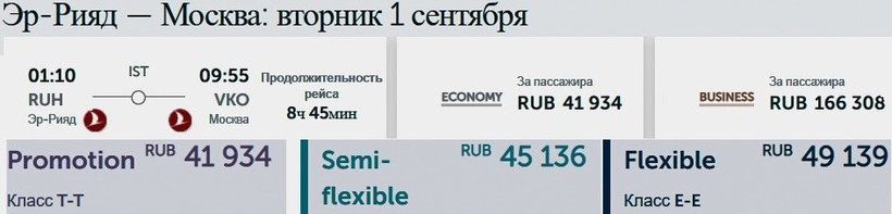 Saudi Arabian Airlines (SV 283) Boeing 787 | 09:30 Эр-Рияд (RUH) | 5 ч. 30 мин | 15:00 Москва (SVO) | 10 октября |