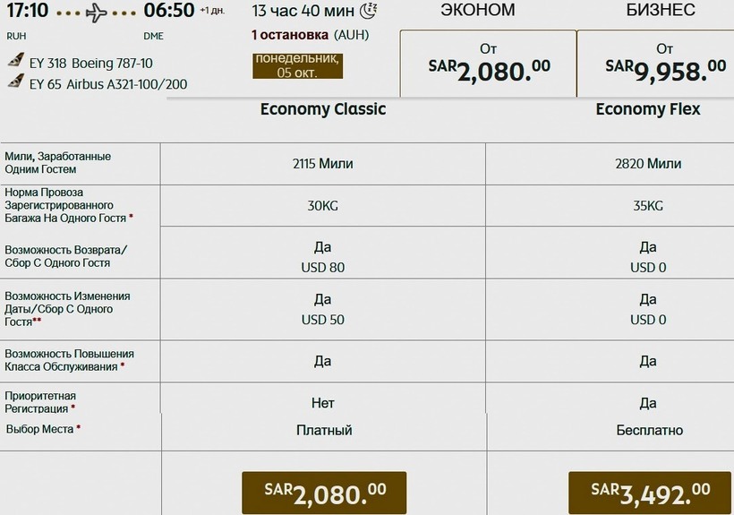С Etihad можно преодолеть путь каждый день через Абу-Даби. Пересадка занимает 6,5 ч., все путешествие длится 13,5 ч. Полет с этой компанией в одну сторону немного дешевле, чем с «Турецкими авиалиниями» — обойдется (с багажом) от 41000 ₽ (2080 саудовских риялов). Туда-обратно лететь с эмиратским оператором не так выгодно — авиапутешествие стоит от 67000 ₽ (3385 SAR). Бизнес-класс — от 196500 ₽ (9960 SAR).