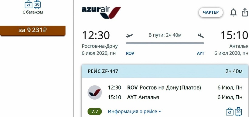 Azur Air (ZF 449) Boeing 757-200 | 11:00 Ростов-на-Дону (ROV) | 2 ч. 40 мин | 13:40 Анталия (AYT) | пн с 02.05 по 26.09 |