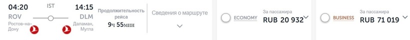 Регулярные круглогодичные перелеты по маршруту Ростов-на-Дону — Стамбул — Даламан предлагает турецкий авиаоператор Turkish Airlines. Продолжительность максимально быстрого варианта транзитного рейса, который доступен пять раз в неделю, составляет от 6,5 до 10 часов. В это время заложена и стыковка в Новом аэропорту Стамбула (от 2,5 до 5,5 часов). Стоимость билетов только туда — от 20900 рублей (за две недели и более). Подчеркну, что у авиаоператора стабильные цены на авиабилеты. Но если вы собираетесь в путешествие во время популярных праздников (например, новогодних), то советую бронировать билеты заранее, желательно за полгода, чтобы купить их по минимальной цене.
