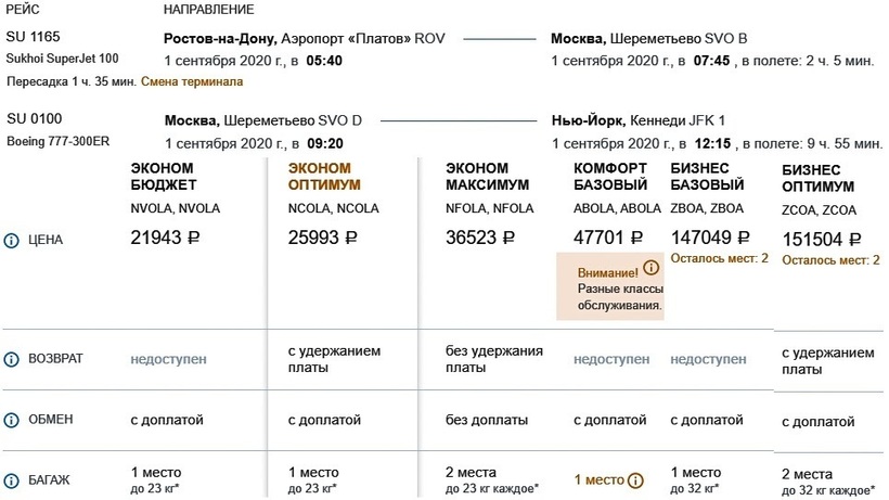 У «Аэрофлота» удобный график полетов по маршруту — компания осуществляет круглогодично по два-три ежедневных перелета через Шереметьево. С пересадкой длительностью 1,5–2,5 часа авиапутешествие занимает 13,5–15 ч. Билеты у оператора не очень дешевые: только туда можно купить за 20500–22000 ₽, в обе стороны полет обойдется от 37000 ₽. Минимальный тариф «Бюджет» включает провоз чемодана багажа весом до 23 кг, так что пассажирам, летящим с ручной кладью, сэкономить не удастся. Путешествие в бизнес-классе у «Аэрофлота» стоит от 147000 ₽.