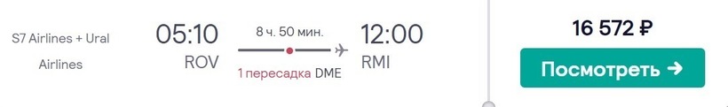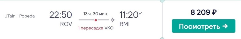 Один из самых дешевых транзитных рейсов предлагают российские авиаоператоры «ЮТэйр» (выполняет полет до Москвы) и «Победа» (осуществляет перелет до Римини). Сразу скажу, что этот авиаперелет доступен ежедневно только с середины весны по конец октября. Дорога до места назначения займет 13,5 ч. Из этого времени на стыковку в московском аэропорту Внуково отводится 8 часов. Билеты за 1,5 месяца и более до вылета сможете купить минимум за 8200 рублей. Учтите, что у перевозчиков нет договоренности о пересадке и во Внуково вам нужно будет пройти предполетные процедуры (зарегистрироваться на рейс, забрать багаж и т. д.).