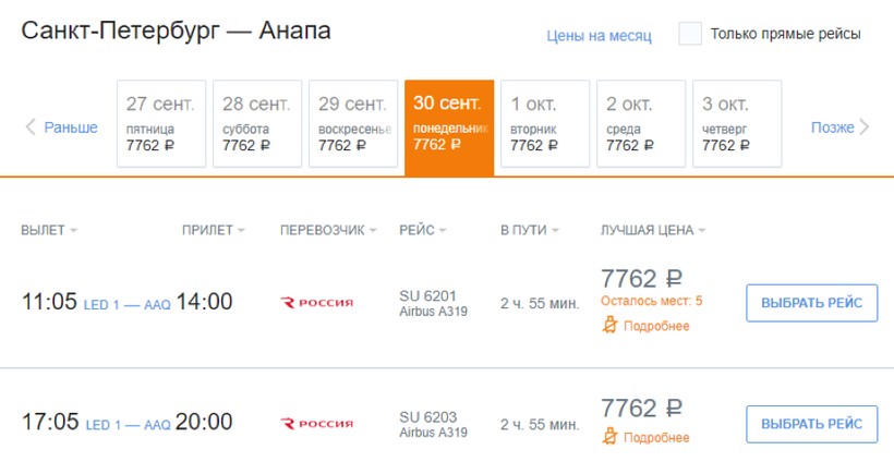 Из Санкт-Петербурга до Анапы можно долететь с «Аэрофлотом». К плюсам полета с этой компанией отнесу удобное расписание. Есть несколько ежедневных вылетов до октября, затем самолеты будут летать 1 раз в день до 26 октября 2019 г. После этого останутся только рейсы со стыковками.