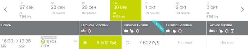 Предусмотрены утренний и вечерние рейсы, после 1 октября останется один утренний вылет. Время полета составляет 3 часа. У компании стабильная цена, поэтому вы можете купить билет даже за день до вылета, он будет стоить 8000 рублей. Туда и в обратном можно долететь за 14000 рублей. Это стоимость самого дешевого тарифа, всего у авиакомпании их 5: