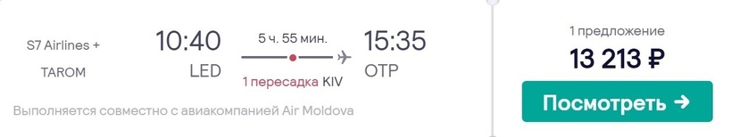 Прямыми авиаперевозками по этому маршруту не занимается ни одна а/к. «Аэрофлот» летает в Бухарест со стыковкой в Москве. А/к осуществляет не менее десяти перелетов в день через столицу РФ. Общее время в пути от 6,5 до 12,5 часа. Рекомендую выбирать рейсы с минимальным временем стыковки в Москве. Так, например, можно вылететь из Питера рано утром и уже ближе к обеду (по местному времени) оказаться в Бухаресте. На дорогу уйдет 6,5 часа, на стыковку — 2 часа. Минимальная стоимость авиабилетов — 11600 рублей.