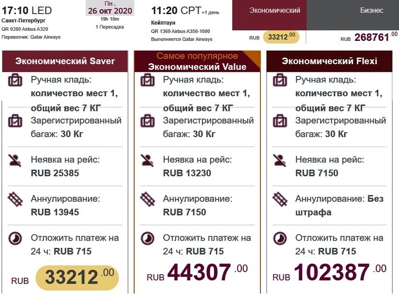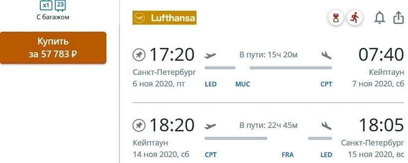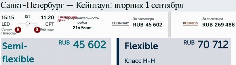 Билеты «туда-обратно» в ноябре обойдутся вам всего в 90 015 рублей, а в августе придется заплатить за них не менее 104 367 рублей. В среднем же, долететь до Кейптауна и вернуться в Санкт-Петербург можно за 95 509 рублей.