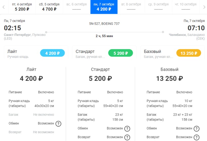 Smartavia (5N 527) Boeing 737 | 01:10 Санкт-Петербург (LED) | 2 ч. 50 мин | 06:00 Челябинск (CEK) | 8 октября |