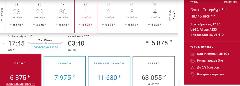 Россия (FV 6463) Сухой Суперджет 100 | 08:35 Санкт-Петербург (LED) | 2 ч. 55 мин | 13:30 Челябинск (CEK) | 3, 4, 6, 8, 10, 14, 15, 17, 18, 21, 22, 24, 25 октября |