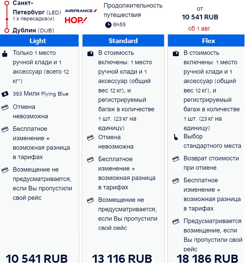 Если вам необходимо преодолеть маршрут в одну сторону, советую выбрать путешествие с авиакомпанией airBaltic, у которой проездные самые недорогие. Полет с балтийским оператором будет дешевле на 4000 ₽, чем с KLM, на 3000–4500 ₽, чем с «Аэрофлотом», и на 2000–4500 ₽, чем с Air France. Я летала по направлению летом туда-обратно с KLM. Хотя у этого перевозчика стоимость авиабилетов в обе стороны сопоставима с Air France и airBaltic (но ниже на 4500 ₽, чем у «Аэрофлота»), зато с нидерландским авиаоператором я потратила на 2,5–7,5 часа меньше времени. Самый недорогой авиаперелет в бизнес-классе предлагают балтийская и французская компании.