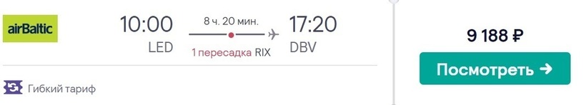 В Дубровник попасть из Питера можно только транзитом — прямое авиасообщение между городами отсутствует. Учитывая, что летом здесь так называемый высокий сезон, и город без преувеличения превращается в туристическую Мекку, то количество авиарейсов в этот период в два раза больше, чем в остальные. Можете рассмотреть вариант путешествия с авиакомпанией airBaltic. Перелеты с латвийской национальной компанией доступны с середины весны по конец октября 2–6 раз в неделю. Общая продолжительность пути — 8,5 ч. На стыковку в Риге из этого времени уйдет 4,5 часа. Теперь про стоимость билетов. Она стабильна (как за неделю, так и за полгода до вылета) и составляет минимум 9100 рублей.