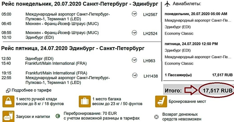 В зависимости от месяца, минимальная стоимость билета на самолет Санкт-Петербург — Эдинбург в одну сторону («туда») колеблется от 12 293 (в декабре) до 39 494 рубля (в апреле) , максимальная может доходить до 43 724 рубля, а в среднем купить билет можно за 20 664 – 22 840 рублей.