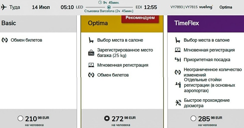 С Vueling преодолеть путь можно в мае-июне и августе-сентябре по вторникам и воскресеньям, в июле — еще и по четвергам. Со стыковкой в 1,5–4,5 часа в Барселоне авиаперелет длится 9,5–11,5 ч. Долететь с Vueling можно только в одну сторону. Путешествие с этим испанским оператором я советую в исключительных случаях, так как авиабилеты у него довольно дорогие: с ручной кладью стоят 17000–23000 ₽ (210–290 €), с багажом — 22000–28500 ₽ (275–355 €).
