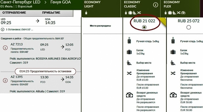 «Аэрофлот» и Alitalia выполняют ежедневные авиарейсы через Рим. С учетом часовой стыковки полет занимает всего 6 ч. Путешествие с этими перевозчиками в одну сторону назвать дешевым не могу — билеты с багажом стоят от 21000 ₽. Зато выгодно бронировать авиаперелет сразу туда-обратно — обойдется всего от 20500 ₽. Тарифа только с ручной кладью по данному направлению у операторов нет. Бизнес-класс предлагается только на отрезке пути Петербург — Рим, а из итальянской столицы до конечной точки маршрута можно долететь лишь в классе эконом. Такой вариант полета обойдется от 33000 ₽.