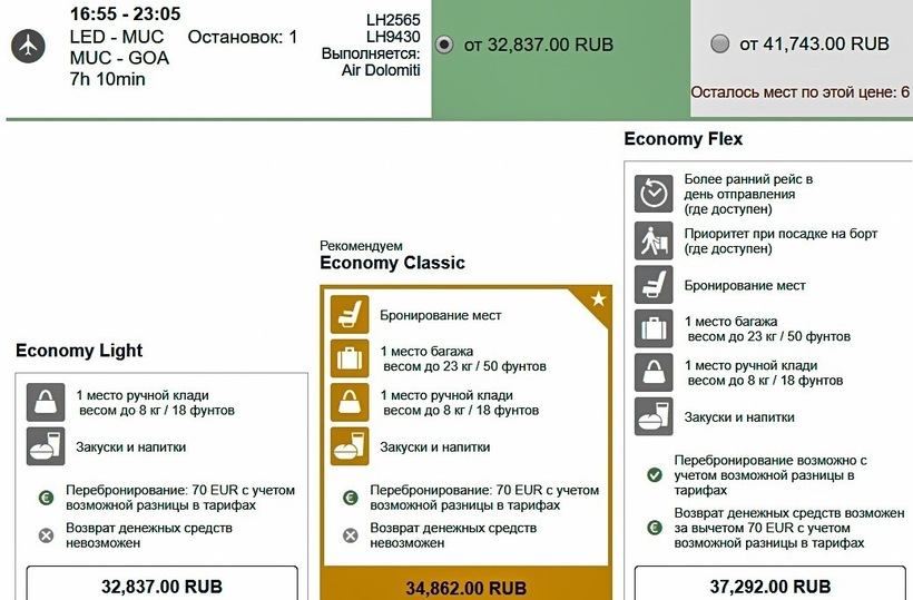 У Lufthansa также довольно удобное расписание полетов — ежедневно по маршруту выполняется по одному авиарейсу. С пересадкой в Мюнхене в 3–5,5 часа авиапутешествие занимает 7–9,5 ч. Как и в случае с вышеупомянутыми операторами, рекомендую у Lufthansa покупать авиабилеты сразу в обе стороны — с багажом обойдутся от 20000 ₽. Стоимость перелета только туда высокая — составит от 35000 ₽. Бизнес-класс — от 41500 ₽.