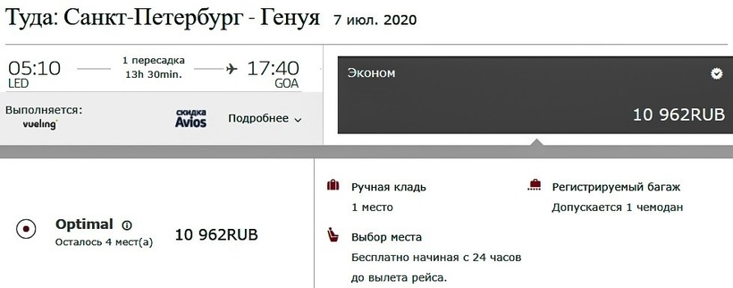 С Vueling можно долететь до точки назначения в мае-июне и августе-сентябре по вторникам и воскресеньям, в июле — еще и по четвергам. С пересадкой в Барселоне в 2,5–11 часов путешествие занимает 8–16,5 ч. В случае, когда стыковка (дневная) длится более 6 часов, рекомендую вместо ожидания в аэропорту посмотреть достопримечательности испанского города. Например, отправиться к знаменитому Храму Святого Семейства, прогуляться по парку Гуэля или Готическому кварталу. Vueling предлагает авиаперелет только в одну сторону, что в среднем на протяжении сезона будет стоить 11000–16500 ₽. Тарифа только с ручной кладью у оператора по данному маршруту нет.