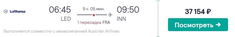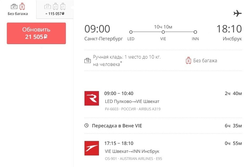 Ежедневные рейсы по маршруту Санкт-Петербург — Вена — Инсбрук предлагает авиакомпания «Россия» (билеты на ее рейсы можно купить через «Аэрофлот») и Austrian Airlines. В дороге в общей сложности проведете от 6,5 до 10 часов (расписание нестабильное). На пересадку в аэропорту Швехат из этого времени отводится от 2,5 до 6,5 ч. Между авиаоператорами нет договоренности о пересадке, так что в аэропорту столицы Австрии придется проходить регистрацию на следующий рейс, забирать/сдавать багаж. Теперь про стоимость билетов. Она стабильна (как за месяц, так и за полгода до вылета) и составляет минимум 21500 рублей. Единственное — в период популярных праздников авиаоператоры повышают цены минимум на 15%. Так что, если поездка выпадает на такие даты, бронируйте авиабилеты заранее (за 3–6 месяцев). Оформляя проездные документы не только туда, но и в обратную сторону, получите небольшую скидку.