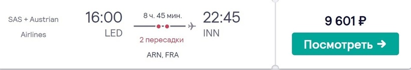 Рейсы с двумя стыковками можно рассматривать как более дешевый способ добраться до конечного пункта. Один из самых оптимальных вариантов предлагают авиакомпании SAS и Austrian Airlines. Дорога до Инсбрука займет около 9 часов. Из этого времени на стыковки в Стокгольме и Франкфурте-на-Майне уйдет 4 часа. Вариант перелета доступен 5–6 раз в неделю. Что касается стоимости билетов, то она вполне приемлемая — от 9600 рублей (за месяц и более до даты вылета).
