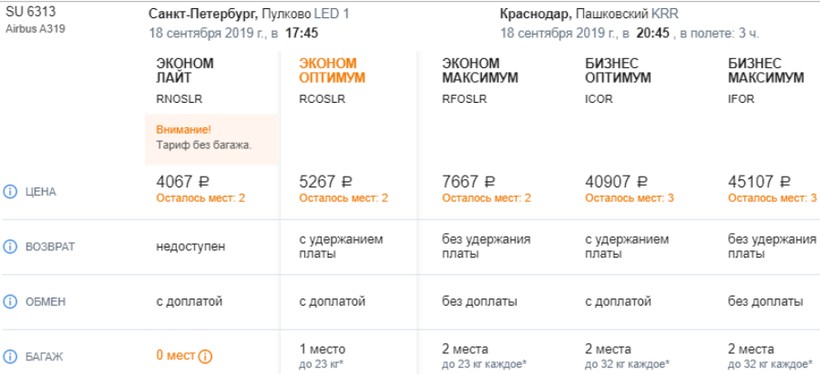 Аэрофлот (SU 2954) Airbus A320 | 05:35 Санкт-Петербург (LED) | 4 ч. 35 мин | 10:10 Краснодар (KRR) | 13, 20 октября |