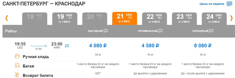 Кроме упомянутых перевозчиков, ежедневно по одному прямому (дневному) авиарейсу из Петербурга в Краснодар выполняет бюджетная авиакомпания «Победа». И хотя по опыту я не могу назвать перелеты с лоукостерами комфортными (самолеты маленькие, багаж, питание и выбор места на борту — за дополнительную плату), но для путешествия по маршруту часто выбираю этого оператора, потому что он предлагает дешевые билеты. Полет только туда обойдется в среднем в 2700–3100 ₽ (на редкие вылеты — 4100 ₽), в обе стороны — от 5400 ₽. За багаж нужно платить отдельно — по 800–1000 ₽ в одну сторону.