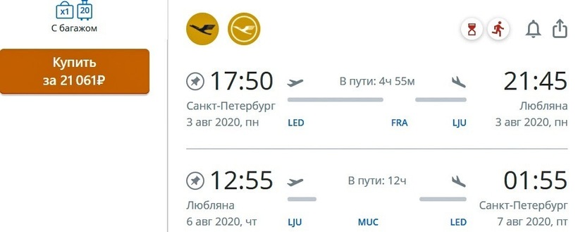 Между Петербургом и столицей Словении прямые авиарейсы не выполняются, но налажено хорошее транзитное авиасообщение. Преодолеть маршрут круглогодично с одной непродолжительной пересадкой можно с операторами: