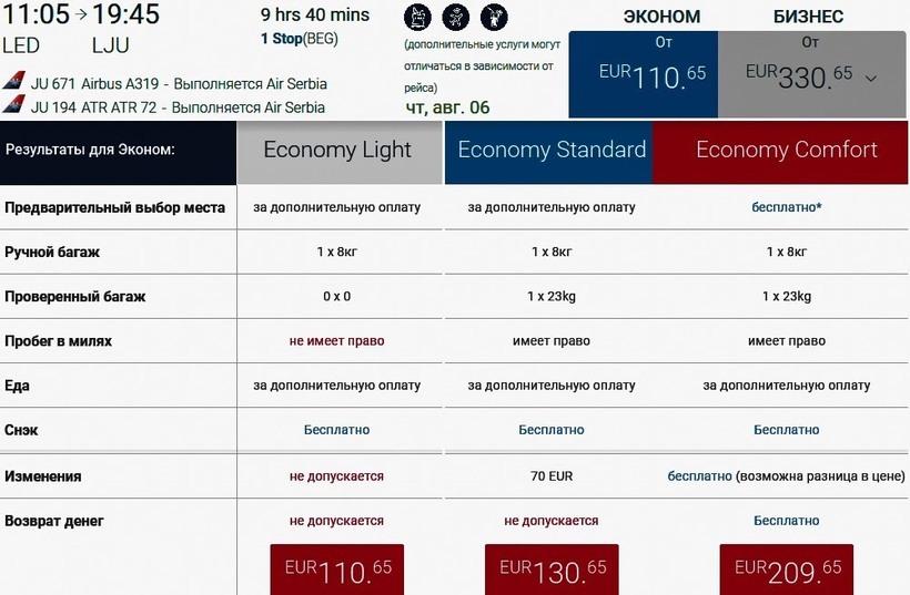 У Air Serbia не очень удобное расписание авиарейсов — самолеты летают только по четвергам. Со стыковкой в Белграде длительностью 5,5 ч. полет занимает 9,5 ч. Я рекомендую этого оператора для перелета в одну сторону, потому что он предлагает самые дешевые билеты: с ручной кладью стоят от 8500 ₽ (110 €), с багажом — от 10000 ₽ (130 €). Проездные туда-обратно обойдутся от 18000 ₽ (235 €) и 21000 ₽ (275 €) соответственно. Бизнес-класс — от 25500 ₽ (330 €). Стоимость актуальна для всех вылетов сезона.