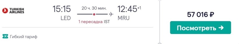 Общая продолжительность пути — 20,5 ч. Из этого времени на пересадку в Новом аэропорту Стамбула уйдет 7 часов. Стоимость билета в одну сторону составляет 57000 рублей (цена актуальна за 2,5 месяца до вылета).