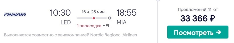 Прямые перелеты из Санкт-Петербурга в Майами не предлагает ни один перевозчик. С пересадкой в Хельсинки до конечного пункта долетите с Finnair (совместно с Nordic Regional Airlines). Общее время в пути — 16,5 часа. Авиабилет за неделю до вылета самолета купите за 33600 рублей (обратный обойдется примерно в такую же сумму).