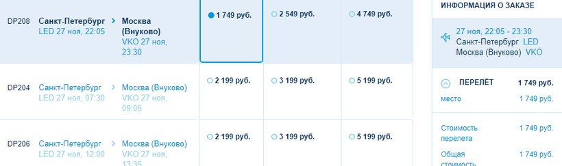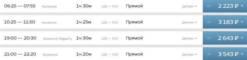 Nordwind Airlines курсирует между Питером и столицей 3–4 раза в сутки. Обратите внимание, что один из рейсов выполняется перевозчиком Pegas Fly. Если вы являетесь участников бонусной программы этого оператора, то советую оплатить поездку именно на его официальном сайте.
