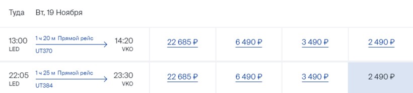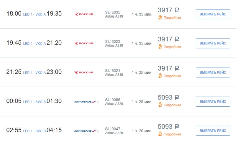Аэрофлот (SU 11) Airbus A321 | 12:00 Санкт-Петербург (LED) | 1 ч. 30 мин | 13:30 Москва (SVO) | 3, 4, 6, 7, 10, 14, 17, 18, 20, 21, 23, 24, 25, 27, 28, 30 ноября, 1, 2, 4, 5 декабря, … |