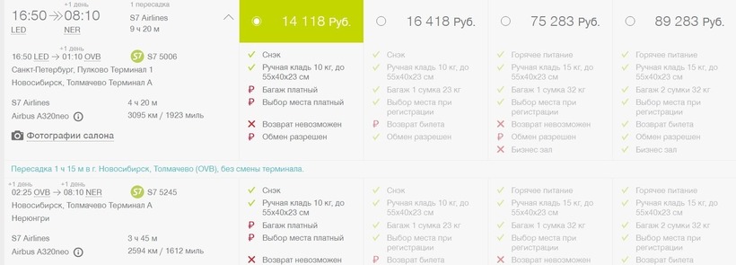 Для маршрута Санкт-Петербург — Новосибирск — Нерюнгри авиакомпания предлагает четыре тарифных плана — два в экономический класс обслуживания и столько же в бизнес. Если стоит задача максимально бюджетно добраться до места назначения, то советую выбрать стартовый (самый дешевый) тариф экономкласса. Он называется «Эконом Базовый». Вот что в него входит: