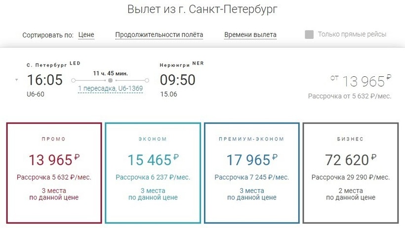 За такие же деньги (авиабилеты от 14000 рублей за месяц) до Нерюнгри доберетесь с другой российской авиакомпанией — «Уральские авиалинии». Общая продолжительность пути — 11,5 ч. Пересадка в столичном аэропорту Домодедово займет около 4 часов. Авиаоператор, как и S7, предлагает 4 тарифа, правда, только один из них в бизнес-класс, а остальные в эконом.