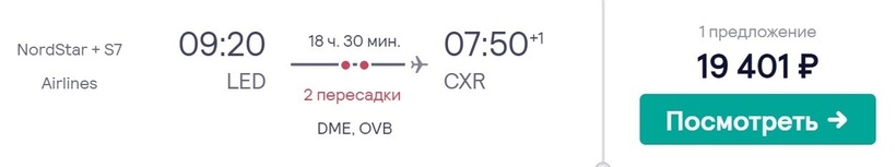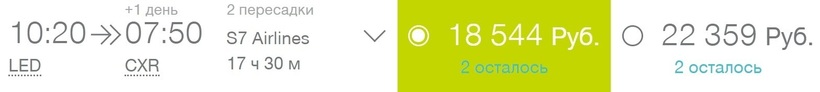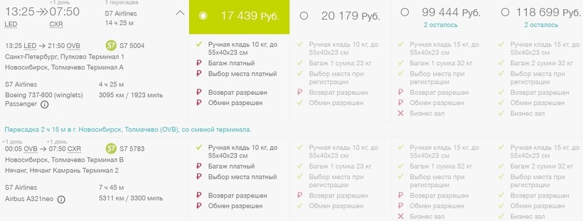 Северную столицу России и вьетнамский город не связывает прямое авиасообщение. Выход есть: летите транзитом. Это можно сделать с одной из самых крупных авиакомпаний РФ — S7. Перевозчик предлагает добраться до конечного пункта с одной пересадкой — в Новосибирске (аэропорт Толмачево — большая и современная воздушная гавань). Общее время в пути — 14,5 ч. На стыковку отведено 2,5 часа. Потребуется смена терминала. Багаж можете зарегистрировать до конечного пункта в аэропорту вылета — Пулково. Теперь про стоимость билетов. Минимальная цена только туда, которую предлагает перевозчик — 17500 рублей (за неделю до вылета).