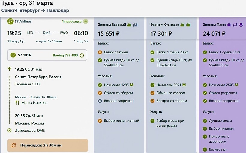Альтернативой прямому рейсу может служить перелет с пересадками от авиакомпании Победа. Минимальная стоимость билета составляет 21 104 рубля.