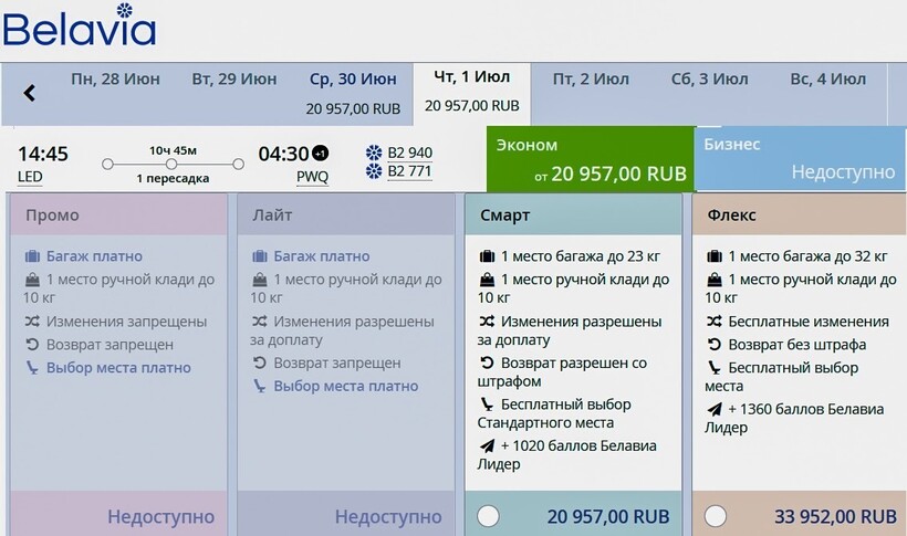 Белорусская авиакомпания значительно уступает российскому перевозчику по графику полетов: самолеты Belavia летают только с июля по середину сентября дважды в неделю — по средам и четвергам. Авиарейсы выполняются с пятичасовой стыковкой в Минске, общее время путешествия составляет 10,5 ч. Полет с этим оператором рекомендую в исключительных случаях, потому что билеты у него не самые дешевые: туда можно купить за 21000 ₽ (с багажом), если забронировать места на борту лайнера и на обратную дорогу, это обойдется от 37000 ₽. Авиапутешествие в бизнес-классе по данному направлению белорусская компания также не предлагает.