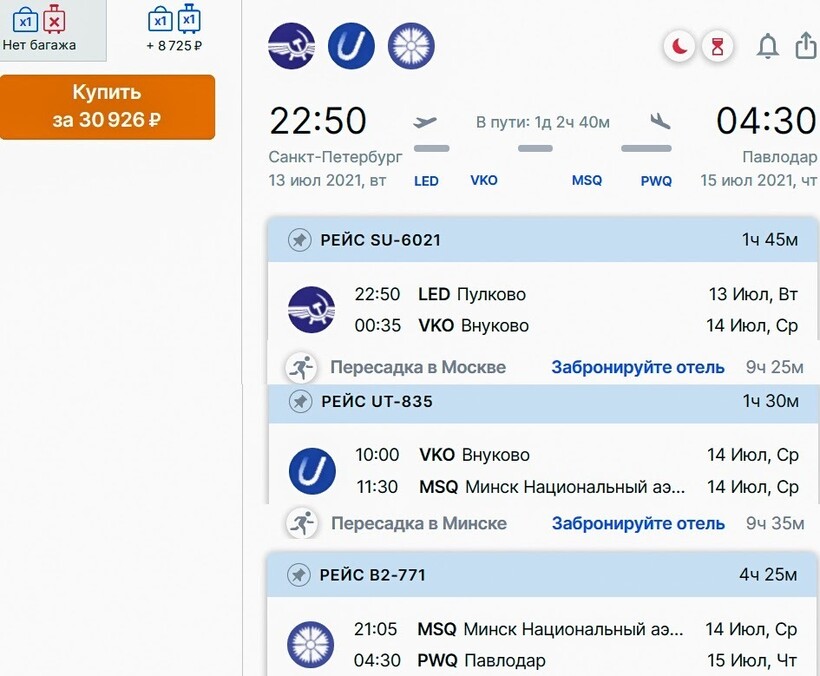Даже если вам нужно преодолевать путь в тот день, когда рейсы с одной стыковкой не выполняются, не советую лететь по направлению с двумя пересадками, так как такой вариант путешествия (например, с «Аэрофлотом», Utair и Belavia) занимает более 24 часов и стоит от 31000 ₽ (дороже, чем с вышеописанными перевозчиками).