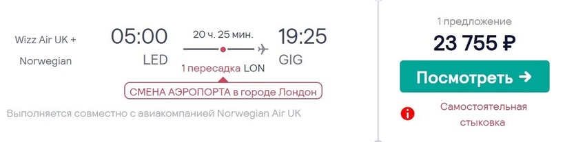 В Лиссабоне предстоит самостоятельная стыковка, так как у а/к нет договоренностей о пересадке. Придется заново зарегистрироваться на рейс, забрать и сдать багаж (при его наличии). Немного быстрее (за 20 ч.) доставит до конечного пункта через Прагу и Лиссабон Smart Wings и TAP Air Portugal. Билеты туда-обратно — от 50000 рублей (за 5 месяцев до рейса). С тремя пересадками до Рио-де-Жанейро можно добраться еще дешевле. Перевозчики — Wizz Air UK, EasyJet, TAP Air Portugal (совместно с Portugalia Airlines). Билеты — от 21500 руб. (при бронировании за 5 месяцев). Стыковки в Лондоне — аэропорт Лутон (5,5 ч.), Лионе — авиаузел Сент-Экзюпери (3,5 ч.), Лиссабоне — воздушная гавань Портела (4 ч.). На дорогу уйдут сутки и семь часов. Все вылеты из воздушной гавани — Пулково (единственный авиаузел Питера). Она располагается примерно в 15 километрах от центра. От станции метро «Московская» добираюсь до нее на автобусах. Стоимость проезда на такси из центра города — около 1000 рублей.
