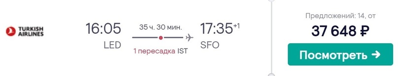 Авиакомпаний, предлагающих транзитные авиаперелеты (прямые рейсы отсутствуют), много. Расскажу про самые актуальные варианты перелетов из Санкт-Петербурга в Сан-Франциско. Через Стамбул летают самолеты авиакомпании Turkish Airlines. Дорога займет 1,5 суток. Продолжительность первого рейса — 3,5 часа, второго — 13,5 ч. На стыковку в Новом аэропорту Стамбула отведено более 18 часов. Если летите международным рейсом этой авиакомпании, в Стамбуле сможете воспользоваться бесплатными туристическими услугами. Они предоставляются, когда стыковка продолжается от шести часов до суток. В аэропорту нужно найти стойку Tour Istanbul и записаться там на ближайшую экскурсию по городу. За сам перелет только туда отдадите минимум 37600 рублей (за неделю). Турецкий перевозчик предлагает как бизнес, так и экономкласс.