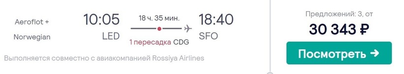 Практически аналогичный тариф у Norwegian называется LowFare +. Этот перевозчик выполняет второй рейс из столицы Франции в Сан-Франциско, продолжительность которого 11,5 часов. Один из самых быстрых способов добраться до конечного пункта — совершить авиапутешествие с airBaltic и KLM. Общее время в пути — 17,5 ч. Но вариант непопулярный из-за количества пересадок (их две) и стоимости билетов (от 145000 рублей за пару недель). Путешествуя со стоповером, билеты за несколько недель можно найти за 20000–23000 рублей. Например, на совместные рейсы LOT, Avion Express и Norwegian билеты (за 2 недели) купите за 20000 рублей. При этом дорога займет немногим более двух суток. Пересадки будет две: в Варшаве и Париже. Самая длительная из них в столице Франции займет 1,5 суток.