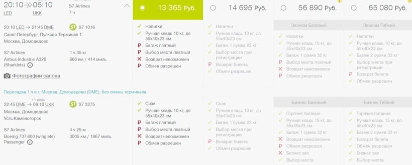 У перевозчика есть как эконом, так и бизнес-класс. Стартовый, соответственно самый дешевый тарифный план — «Эконом Базовый». Он подойдет, если с собой только ручная кладь. Провоз багажа по его условиям только за дополнительную плату, также билет невозвратный (передумаете лететь — потеряете все деньги).