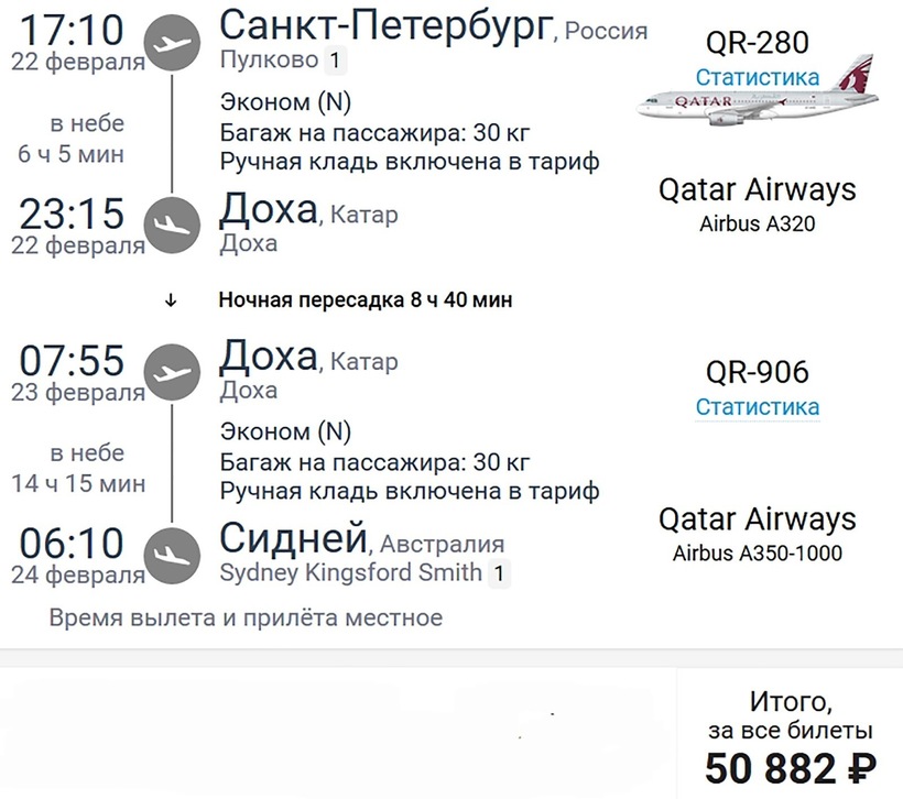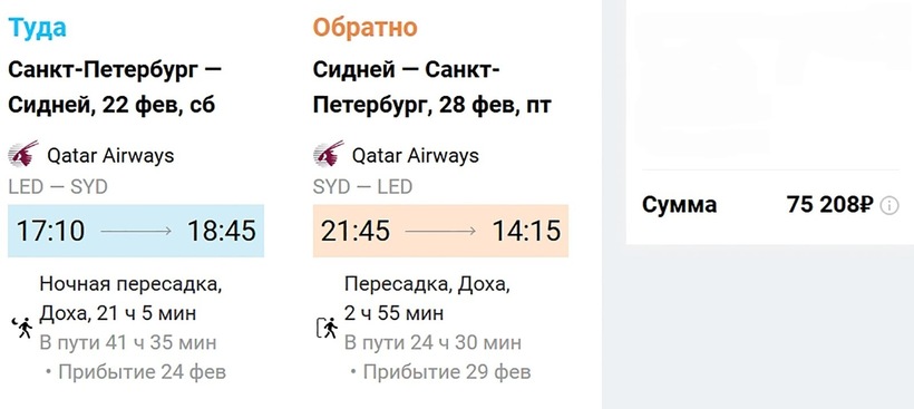 Еще один способ сэкономить — оплачивать сразу рейсы туда и обратно. Тогда ваше авиапутешествие в оба конца обойдется примерно в 75000 ₽.