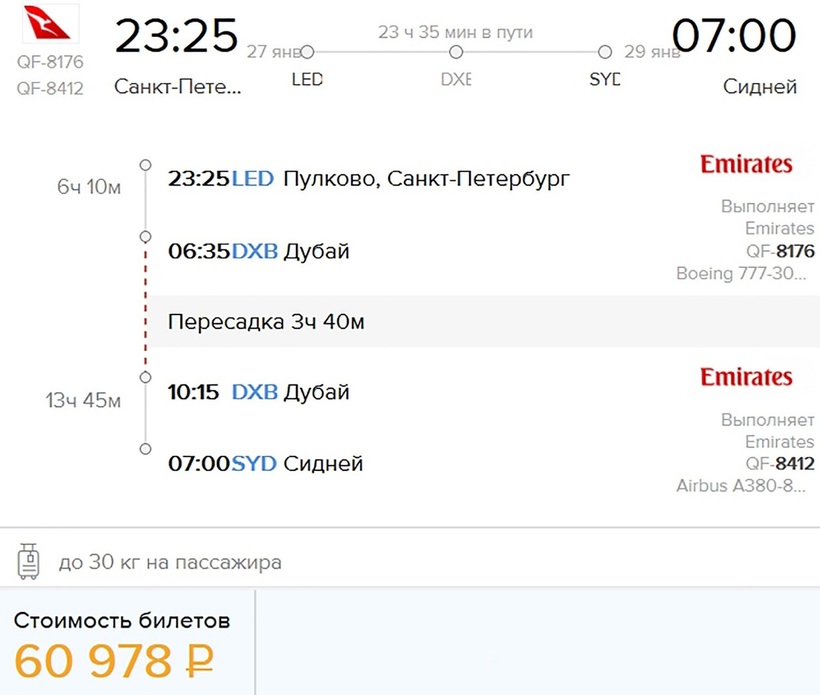 Билеты «туда-обратно» в ноябре обойдутся вам всего в 81 229 рублей, а в июле придется заплатить за них не менее 109 884 рубля. В среднем же, долететь до Сиднея и вернуться в Санкт-Петербург можно за 88 326 рублей.