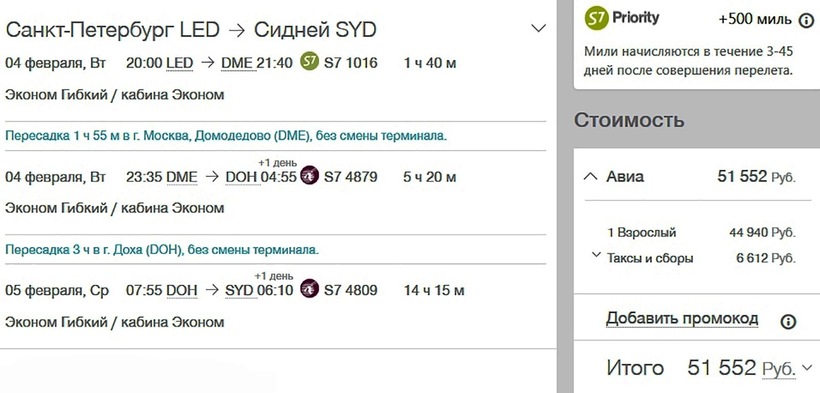 Совместные рейсы S7 и Etihad Airways также ежедневные, со стыковками в Москве и Абу-Даби. Они длятся от 25 до 36 часов. Цена полета в экономклассе начинается с 47000–48000 ₽.